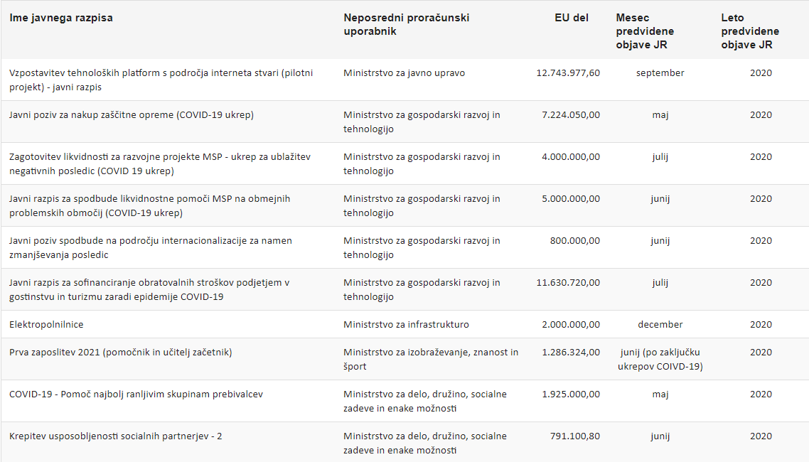 - Povračilo stroškov za zaščitno opremo – 10 mio EUR (bo objavljen že v tem mesecu)