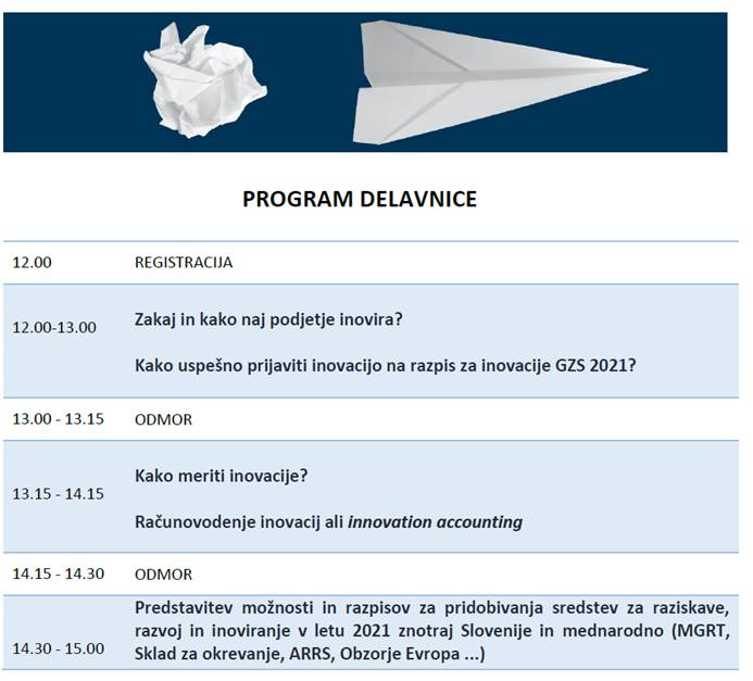 Podrobno bo predstavljen tudi razpis za inovacije Gospodarske zbornice Slovenije 2021 in različne možnosti pridobivanja finančnih sredstev podjetij za raziskave, razvoj in inoviranje v letu 2021.