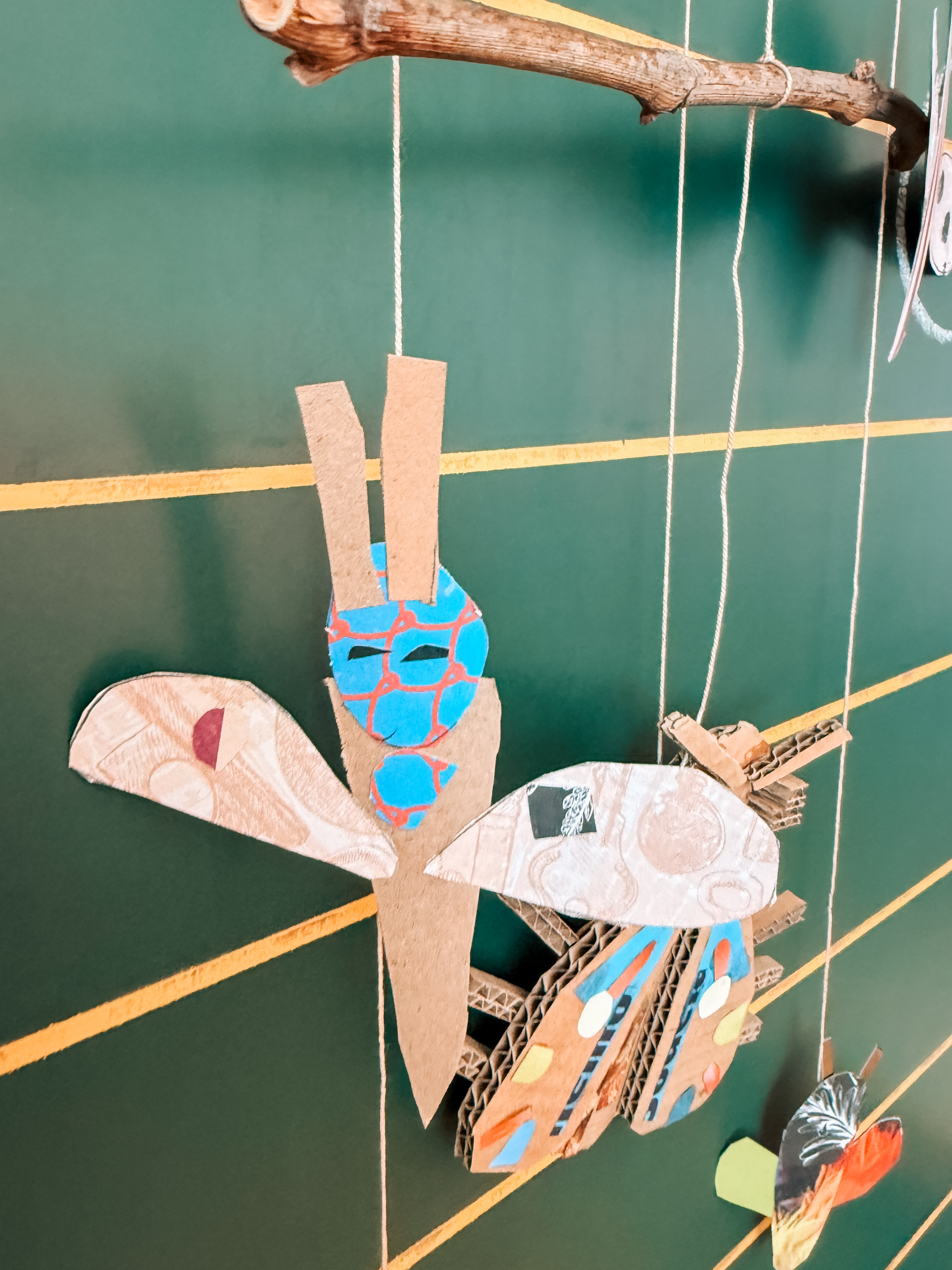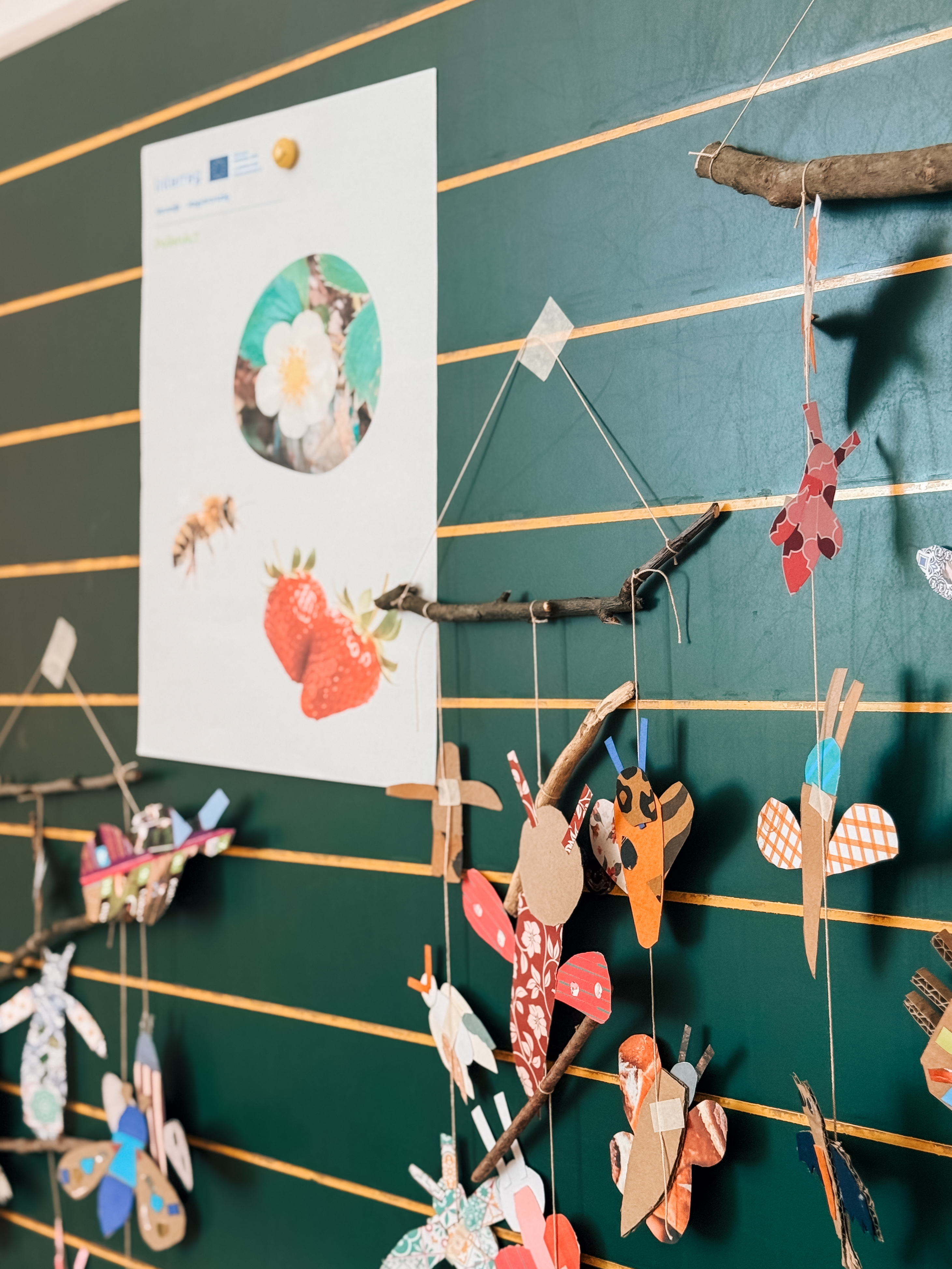 Učenci so s spretno uporabo kolaža izdelovali mobile opraševalcev - vsak je prispeval svoj del, s čimer so nastali čudoviti skupinski izdelki. Ti zdaj krasijo učilnice in služijo kot trajni vizualni opomnik, kako pomembni so čebele, metulji in drugi majhni prebivalci za naš ekosistem.
