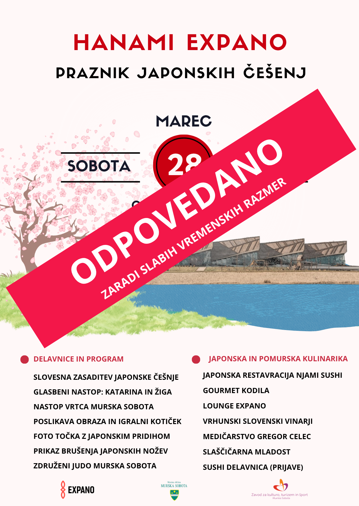 Zaradi napovedanih neugodnih vremenskih razmer smo se organizatorji odločili, da dogodek Hanami Expano – Praznik japonskih češenj, predviden za to soboto, odpovemo.